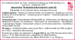 Der Diözesanverband der Kath. Arbeitnehmer-Bewegung (KAB) Bamberg e.V. sucht zum 1. September 2019einen Verbandsreferenten/in (w/m/d) Teilzeitstelle mit 19,5 Stunden-Woche. Dienstsitz ist Kronach.