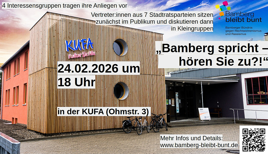 Unter dem Leitgedanken „Demokratie beginnt mit Zuhören“ lädt das Bamberger Bündnis gegen Rechtsextremismus und Rassismus zu einer besonderen Veranstaltung im Vorfeld der OB-Wahl ein. Das Format dreht die gewohnte Perspektive um: Nicht die Kandidierenden sprechen – sie hören zu.