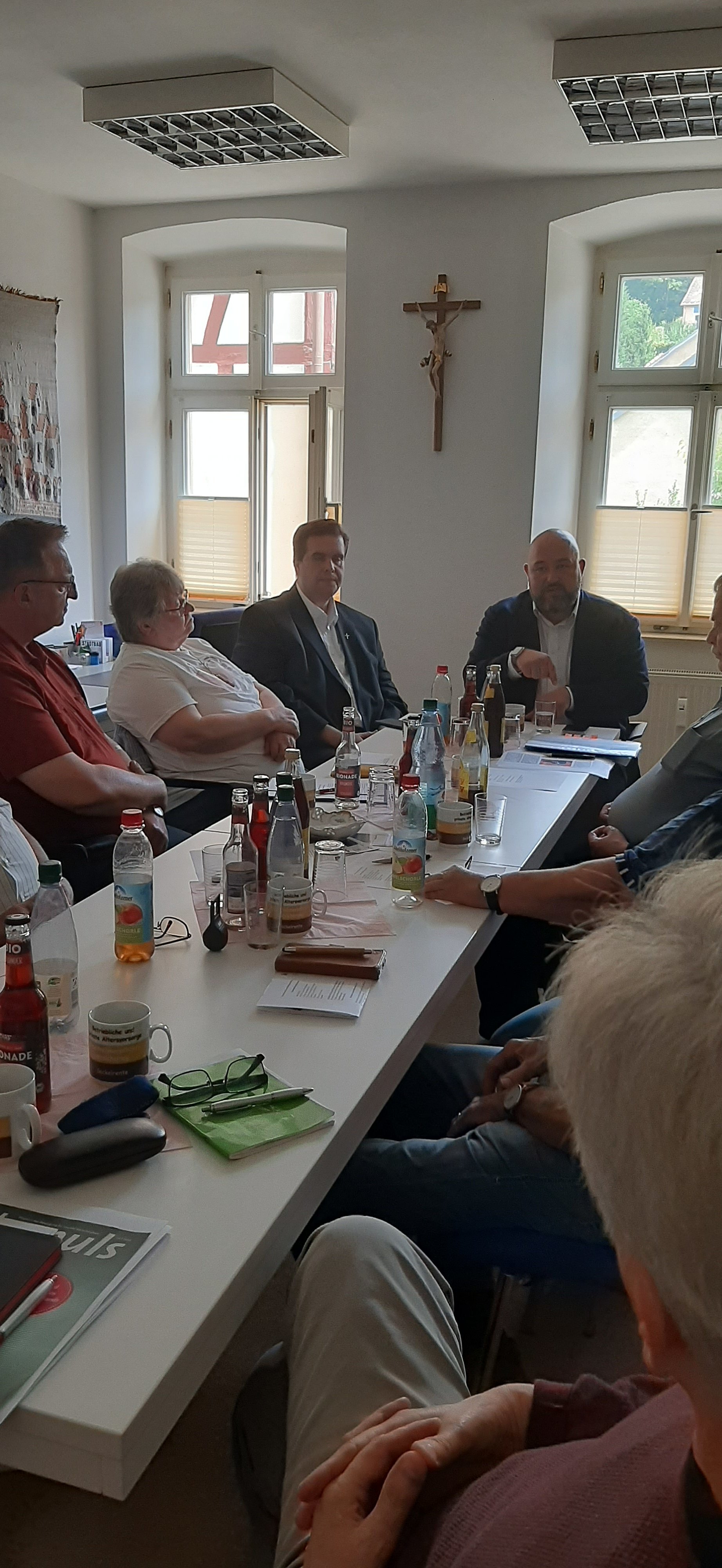 Das Team des Kreisverbandes der KAB Kronach hatte im August zu einem Gedankenaustausch/Treffen mit dem Bundestagsabgeordneten Dr. Jonas Geissler in das KAB-Büro in Kronach eingeladen. Nach der Vorstellungsrunde der vollständig vertretenen Kreisleitung, der Verbandsreferentin, Manuela Mähringer, und des Geschäftsführers des Diözesanverbandes Bamberg, Ralph Korschinsky, wurden die Positionen und die Anliegen der KAB dargelegt und intensiv diskutiert. Dabei ging es um folgende Themen:Rente, Kranken- und Pflegeversicherung, Tarifbindung, Lieferkettengesetz und das aktuelle Regierungsgeschehen.